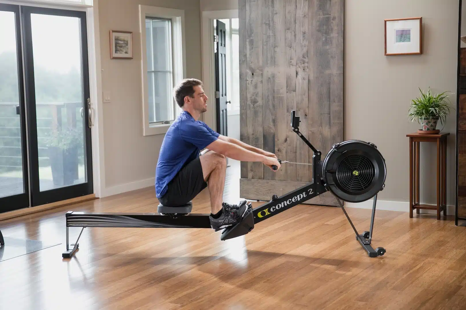 Concept2 Model D Indoor Rower har en rammelås som enkelt lar deg låse og separere maskinen i to deler for lagring. Små hjul på forfoten gjør det enkelt å trille den sammensatte maskinen i posisjon før trening. Fotstøttene er justerbare og håndtaket er ergonomisk og gjør at armene kan holdes i en naturlig posisjon.
